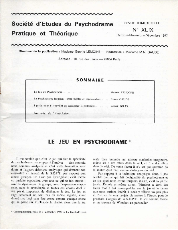 Propositions de lecture LE JEU EN PSYCHODRAME PSYCHODRAME D’ENFANTS – Henri Fromm Arrête de gratter l’amitié – F Benedetti, M Paszt – revue 154 -2014